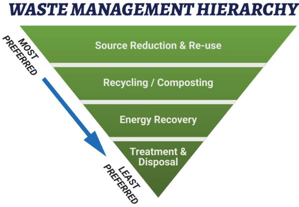 SDS follows the Environmental Protection Agency (EPA) waste management hierarchy in recognizing that no single waste management approach can be used to manage all waste streams. The EPA Hierarchy ranks disposal strategies from most to least environmentally friendly. SDS will always choose a reduction and reuse option when they are available.